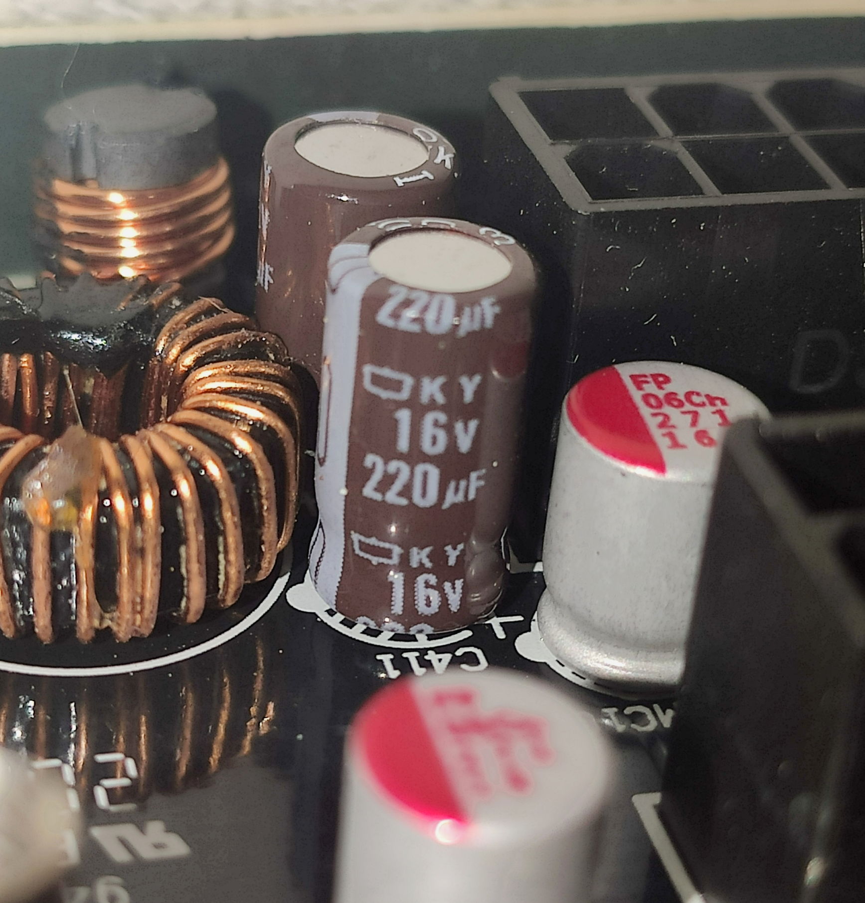 On a plus side, all semiconductors are still from known and trusted brands, no borderline no-name stuff, and they seem to have high enough current ratings, at least on the ones I was able to identify. The PSU has a MOV (metal-oxide varistor) which is responsible for surge protection. It wouldn’t protect the PSU from a lightning strike but some protection from voltage surges in the mains is always a plus. The design uses a good supervisor IC, all necessary protections are present. The fan utilizes a ‘real’ FDB bearing, with grooves on the inner side of the sleeve, in contrast with rifle bearings we often see marketed as FDB/HDB which only have grooves on the outer side (looking at you Arctic). EVGA cites 100k MTBF @ 30°C for it which is good enough. Finally, the PSU design is based on a modern LLC resonant topology with DC-DC converters.